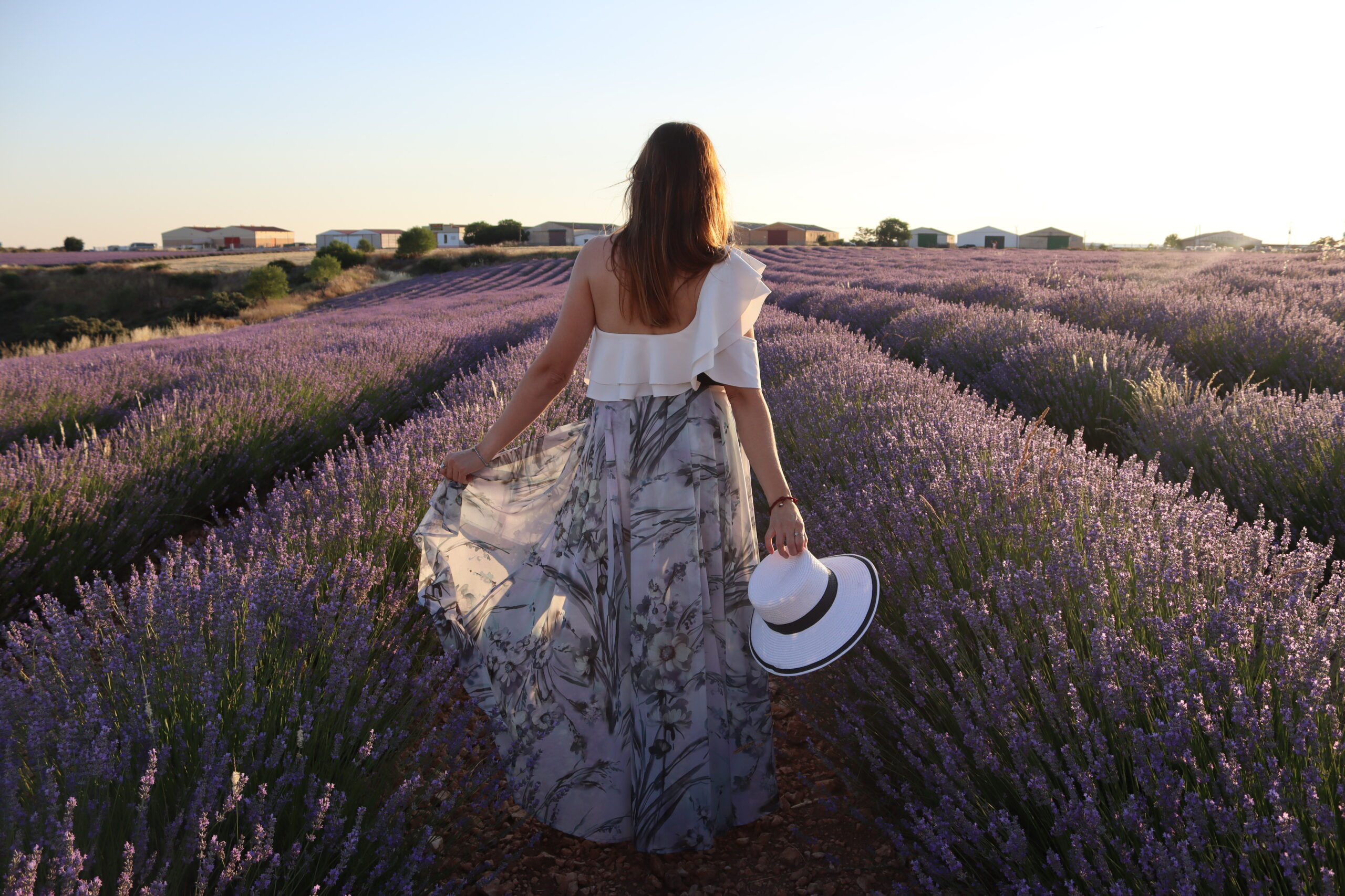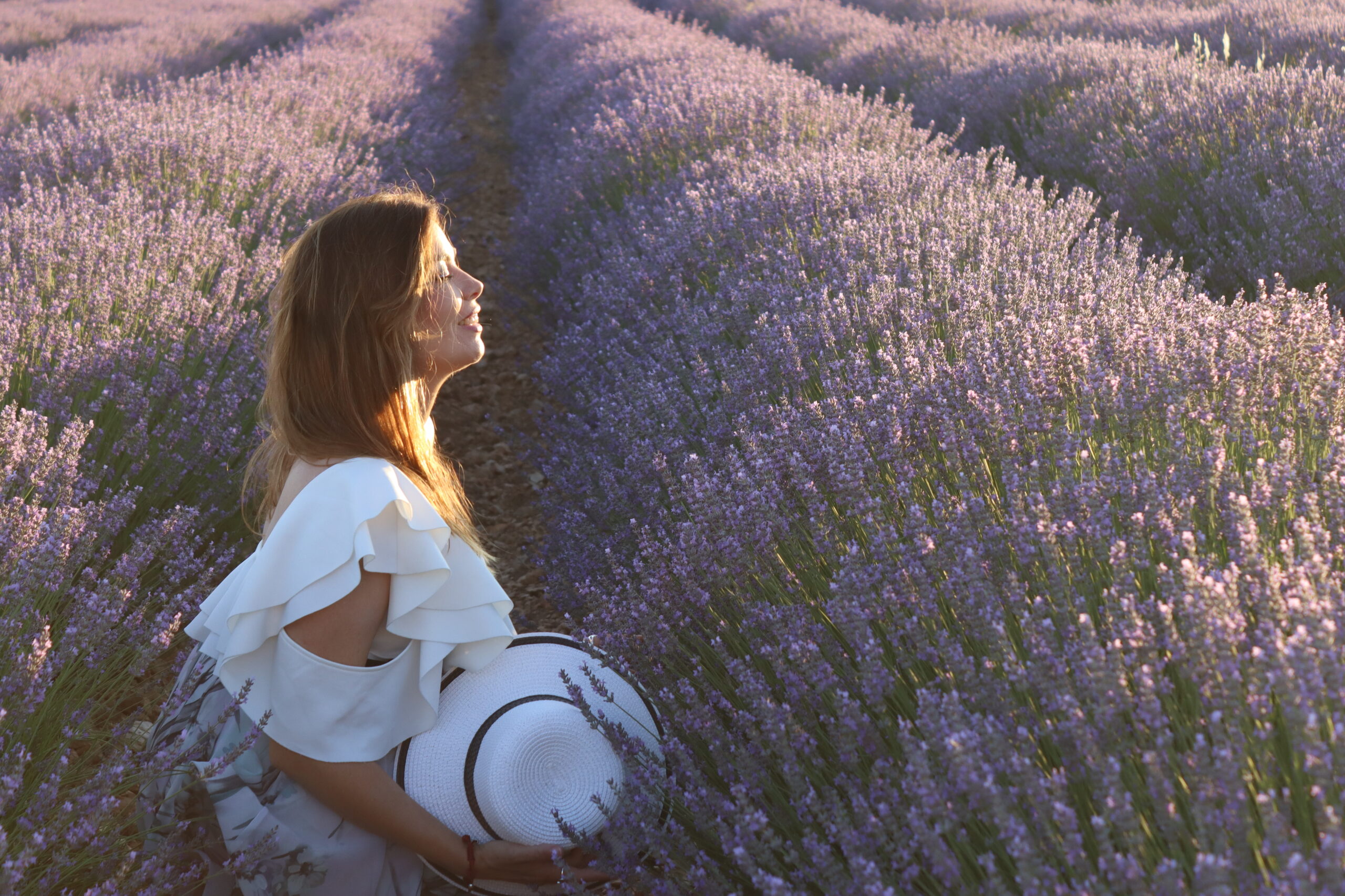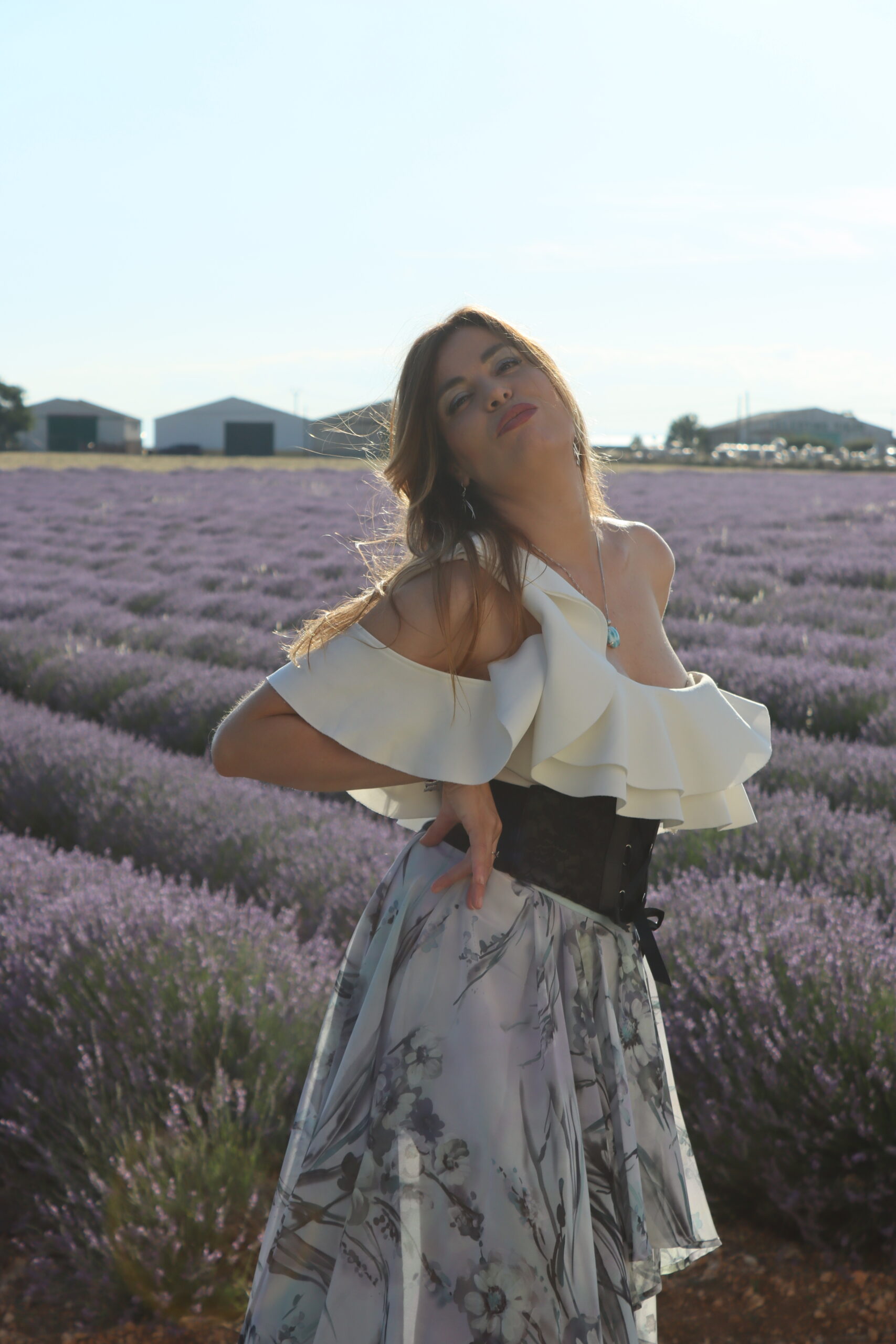 A dreamy composition with expansive sky and lavender stretching endlessly, as she lifts her skirt delicately in the last light of day.