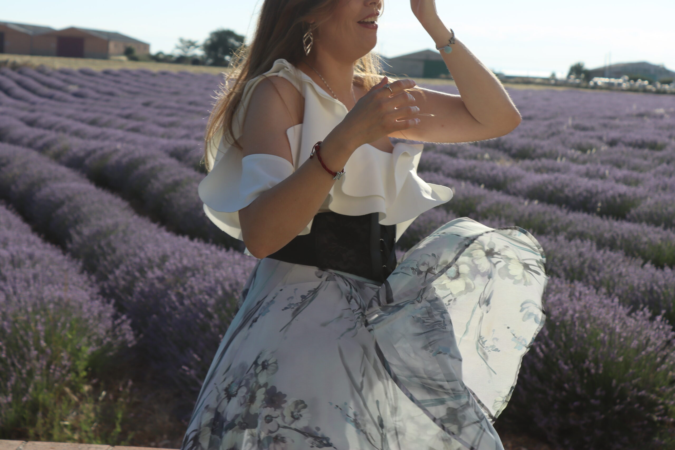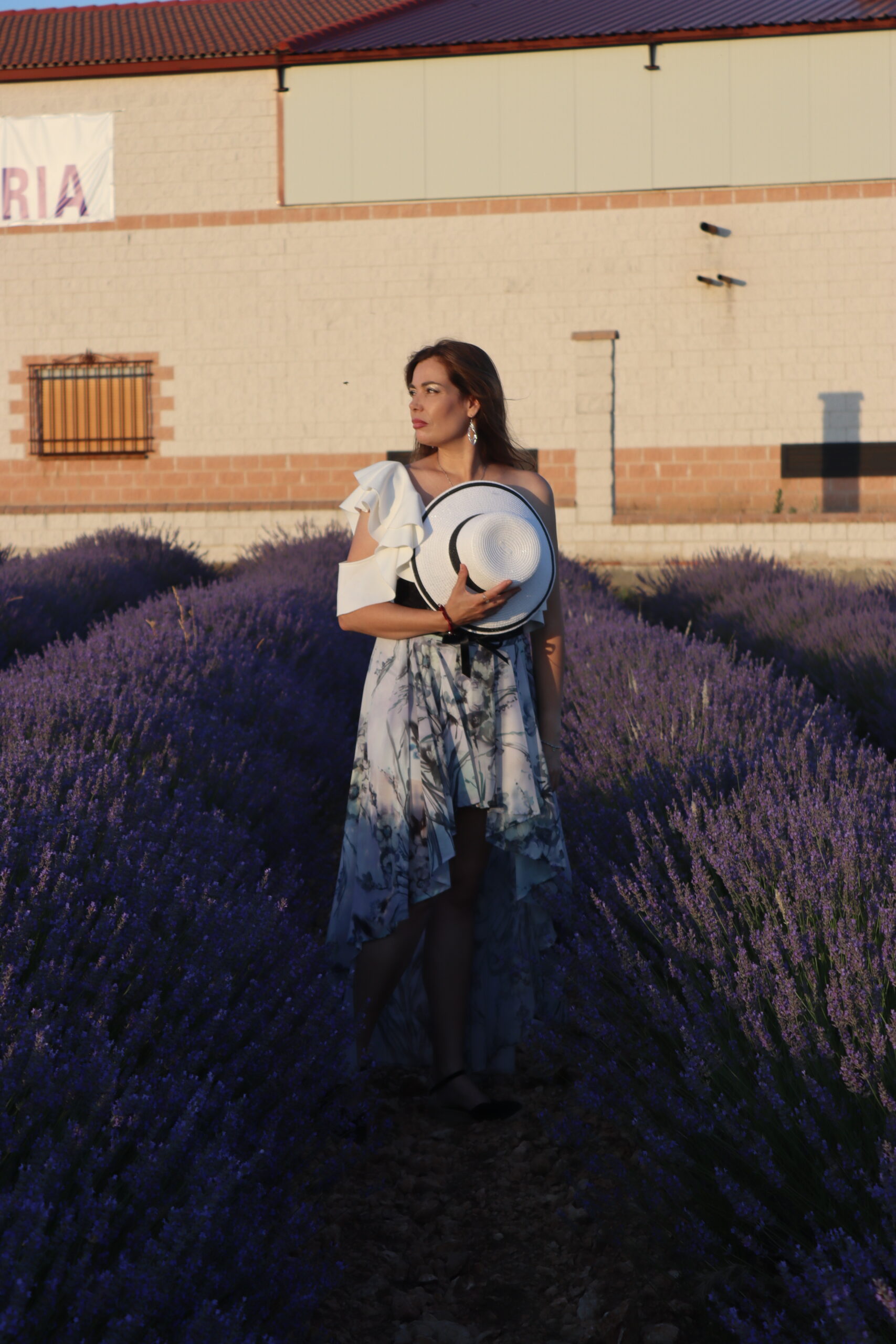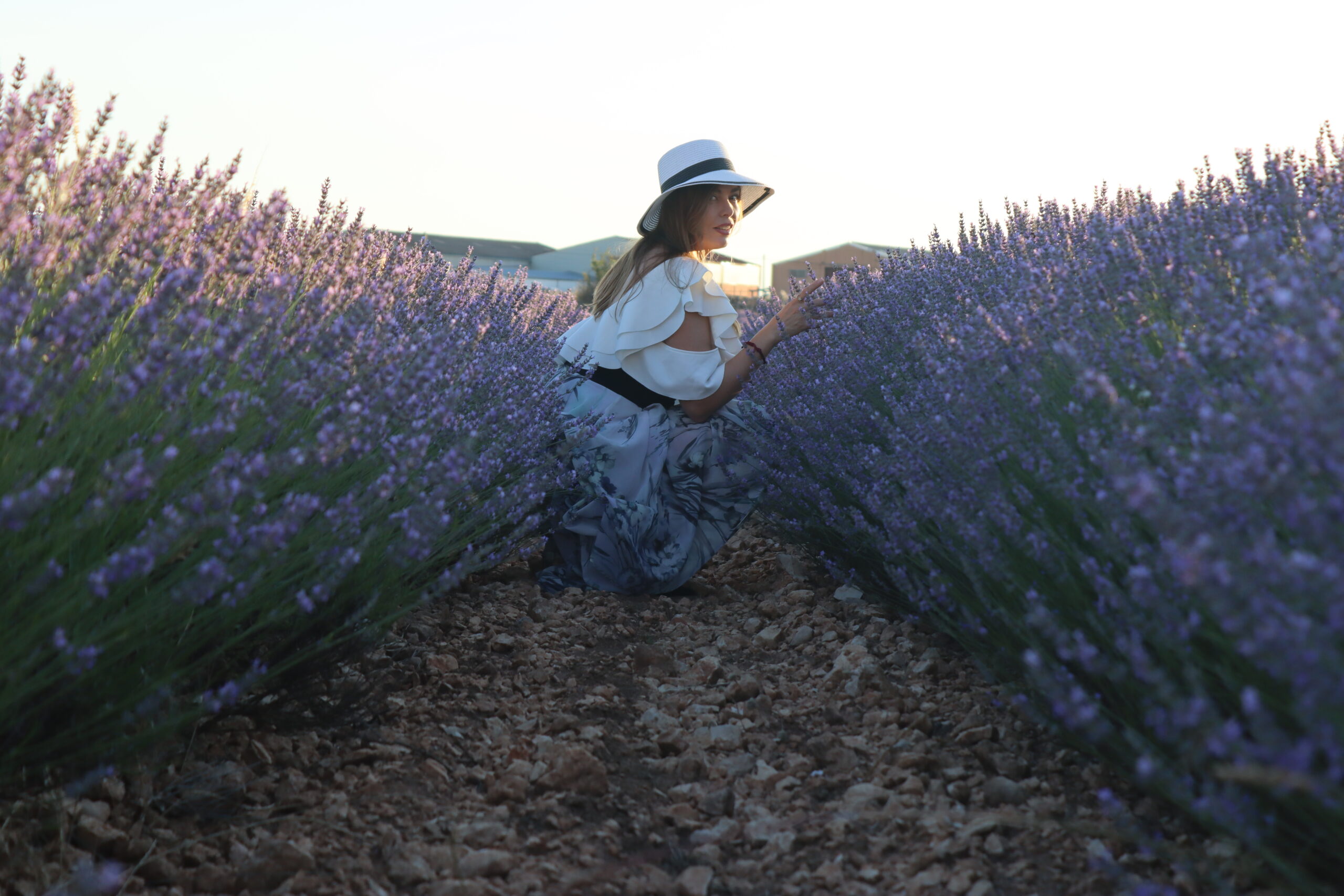 A dreamy composition with expansive sky and lavender stretching endlessly, as she lifts her skirt delicately in the last light of day.