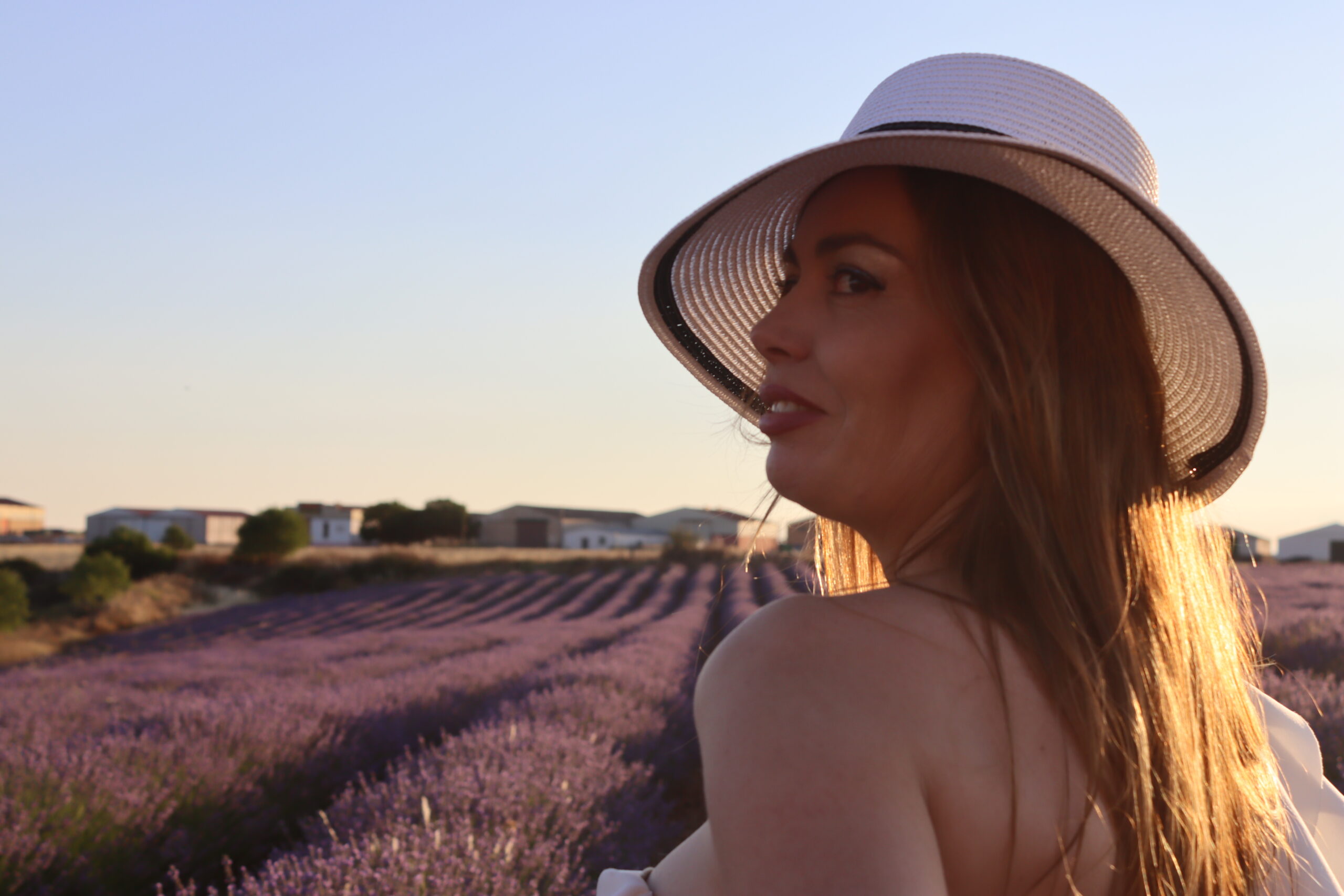 A soft golden-hour portrait where she turns toward the camera, the lavender glowing behind her as her hat catches the evening light.